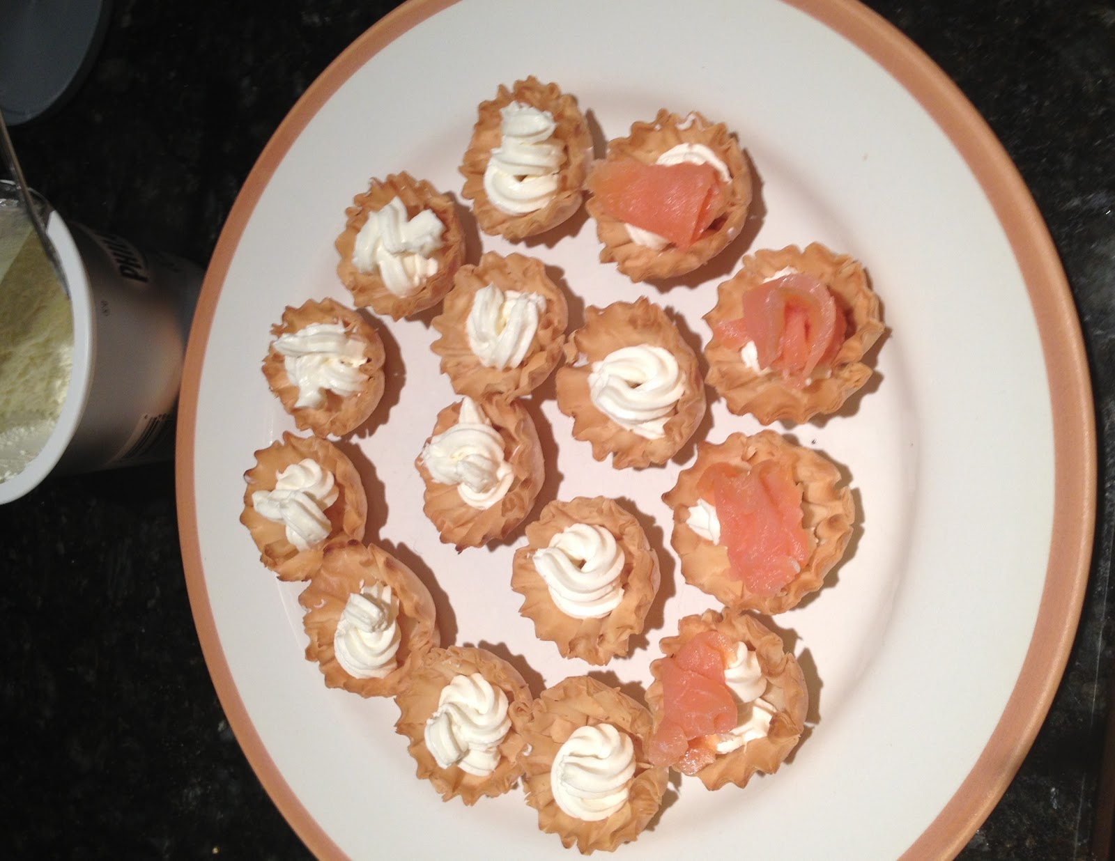 - Preheat oven to 350 degrees F (175 degrees C) and bake the fillo shells for 6 minutes or until golden brown. Remove from oven and let cool.