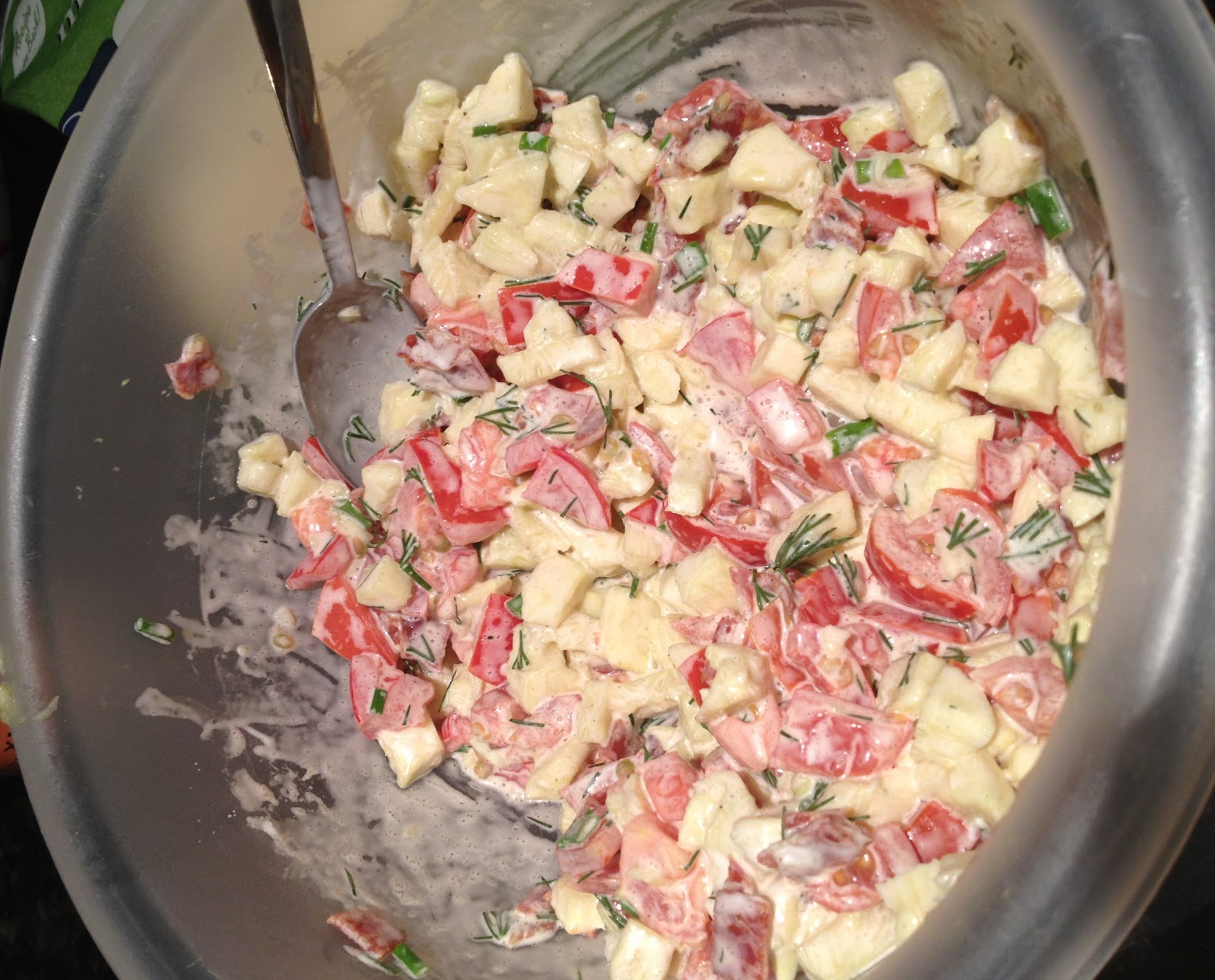 - Cut the tomatoes, salami (optional), chives and dill, and add them to the bowl.