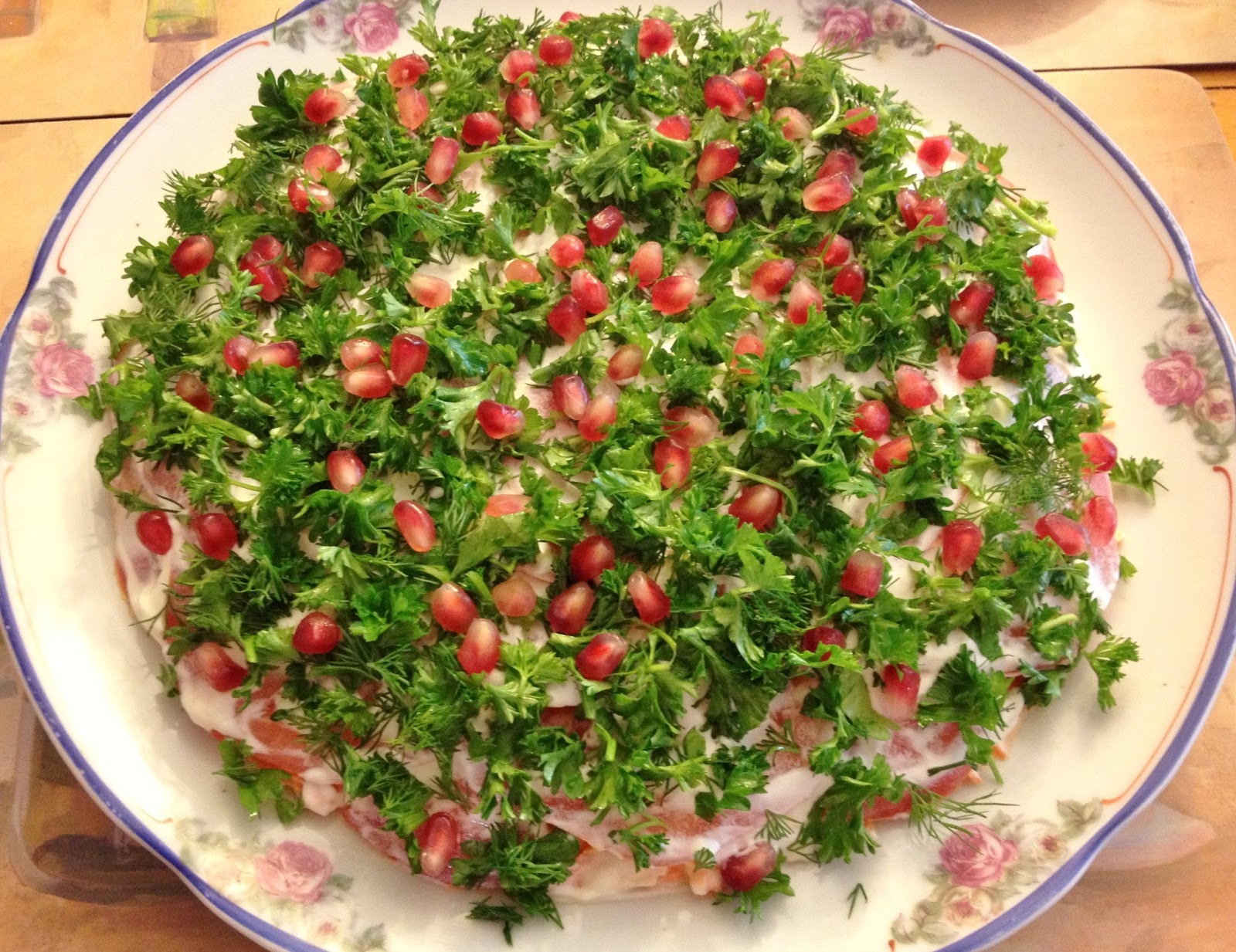 - Decorate with chopped fresh dill, parsley and pomegranate seeds.