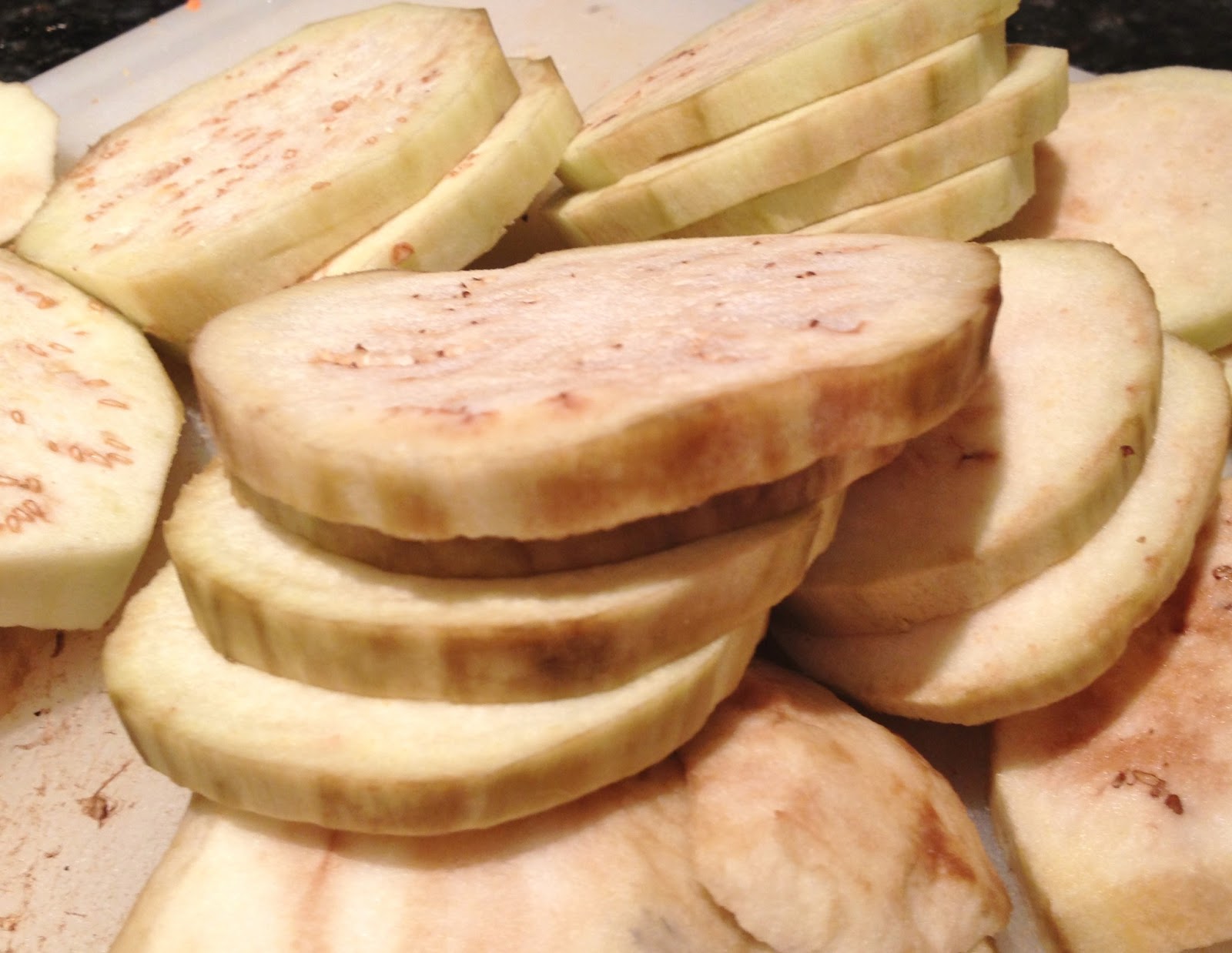 - Slice the eggplant into 1 inch slices.