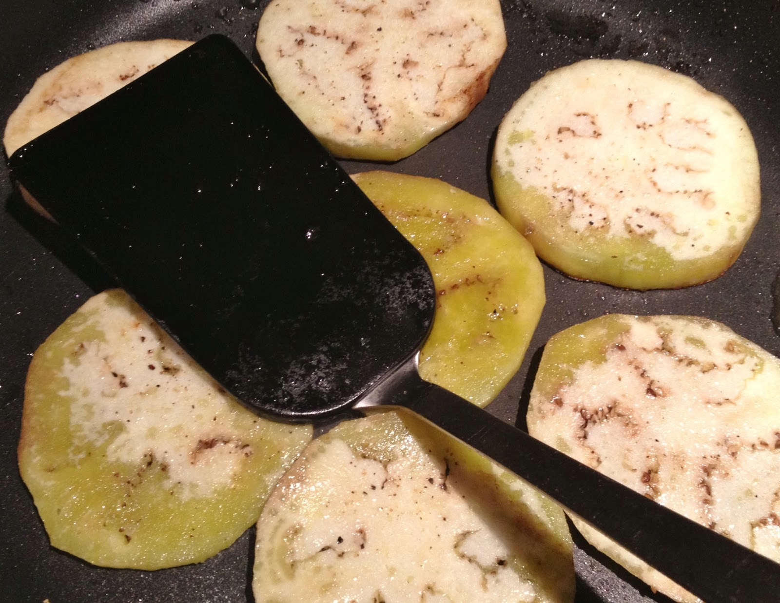 - Pan fry the eggplant, add salt and pepper to taste.